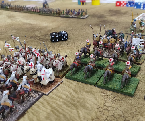 I had the Muslim right flank, Brian had the left and centre. We chose a mission that gave us a move-shoot-retire order on each flank and manoeuver in the centre. Opposite John has the Christian centre and left, and Kev has their right.